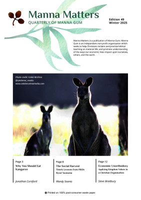 Manna Matters is the quarterly of Manna Gum, covering topics such as Economics in the Bible, Everyday economics, Understanding the times, People living differently, Ecology in crisis, Poverty and Development.